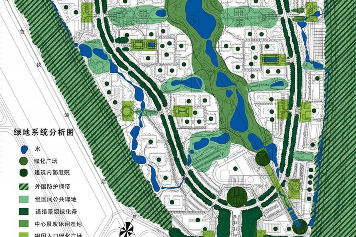 Город-губка согласно идеям Конжана Ю. Перевод экспликации схемы анализа системы зеленых насаждений: вода; озелененная площадь; двор здания; внешняя защитная зеленая полоса; групповая общественная зеленая зона; дорожная ландшафтная лесополоса; жилая ландшафтная зеленая зона; групповая входная зеленая площадь
