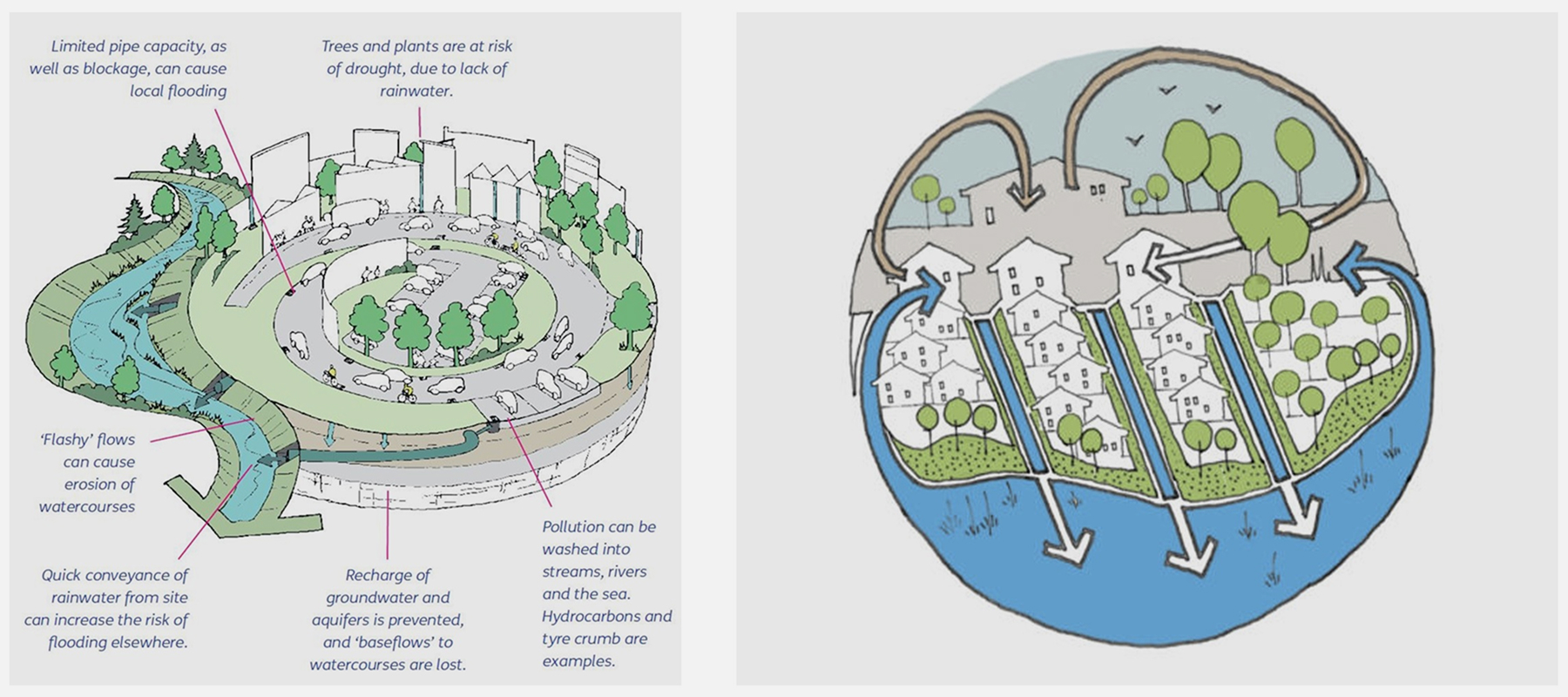 Sustainable Drainage Systems (SuDS, Великобритания, 2000-е) закрепляют эту логику на уровне планирования и нормативов, связывая управление стоком с качеством городской среды, биоразнообразием и общественными пространствами.