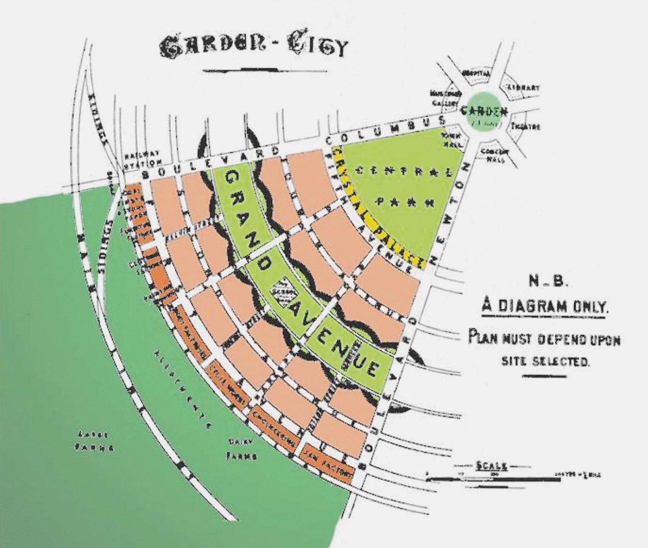 План города-сада Эбенезера Говарда из книги «Города-сады завтрашнего дня». 1898