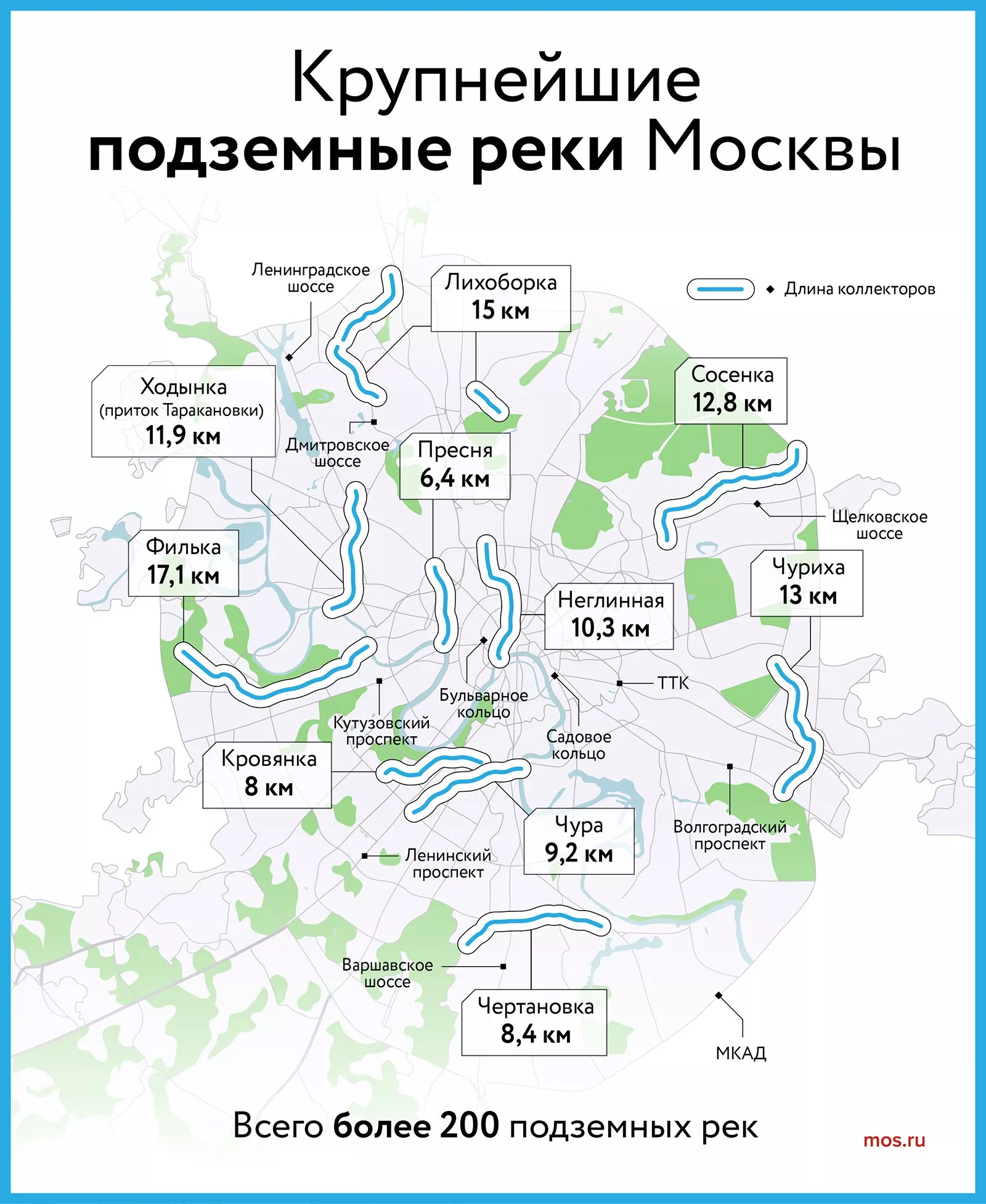 В результате формируется модель города, в которой природные водные процессы изолируются и переводятся в управляемый подземный контур. Так, сегодня по данным ГУП «Мосводоканал» в коллекторах течет вода из более чем 200 водотоков, общая длина которых превышает 300 километров.