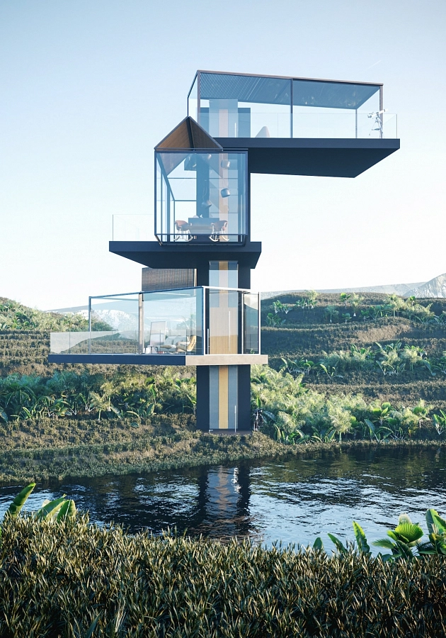 В проекте частного особняка от архитекторов бюро Adriano Design лифт, точнее его шахта, играет роль элемента, организующего пространство. Жилые объемы нанизаны на вертикаль шахты, как куски мяса на шампур.