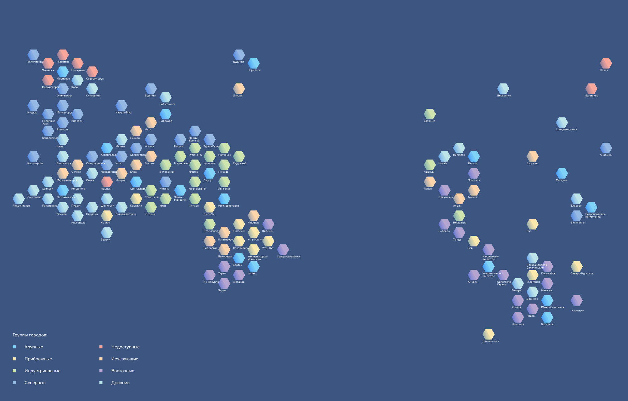 Таким образом выделилось 8 групп городов, в условных названиях которых нашла отражение их специфика. При этом сравнение комплекса ранжированных показателей применительно к выделенным группам — с точки зрения уже сложившихся условий формирования общественных пространств — показало всю внутреннюю неоднородность той совокупности городов, которую нормативно-правовые документы относят к Крайнему Северу и АЗРФ.