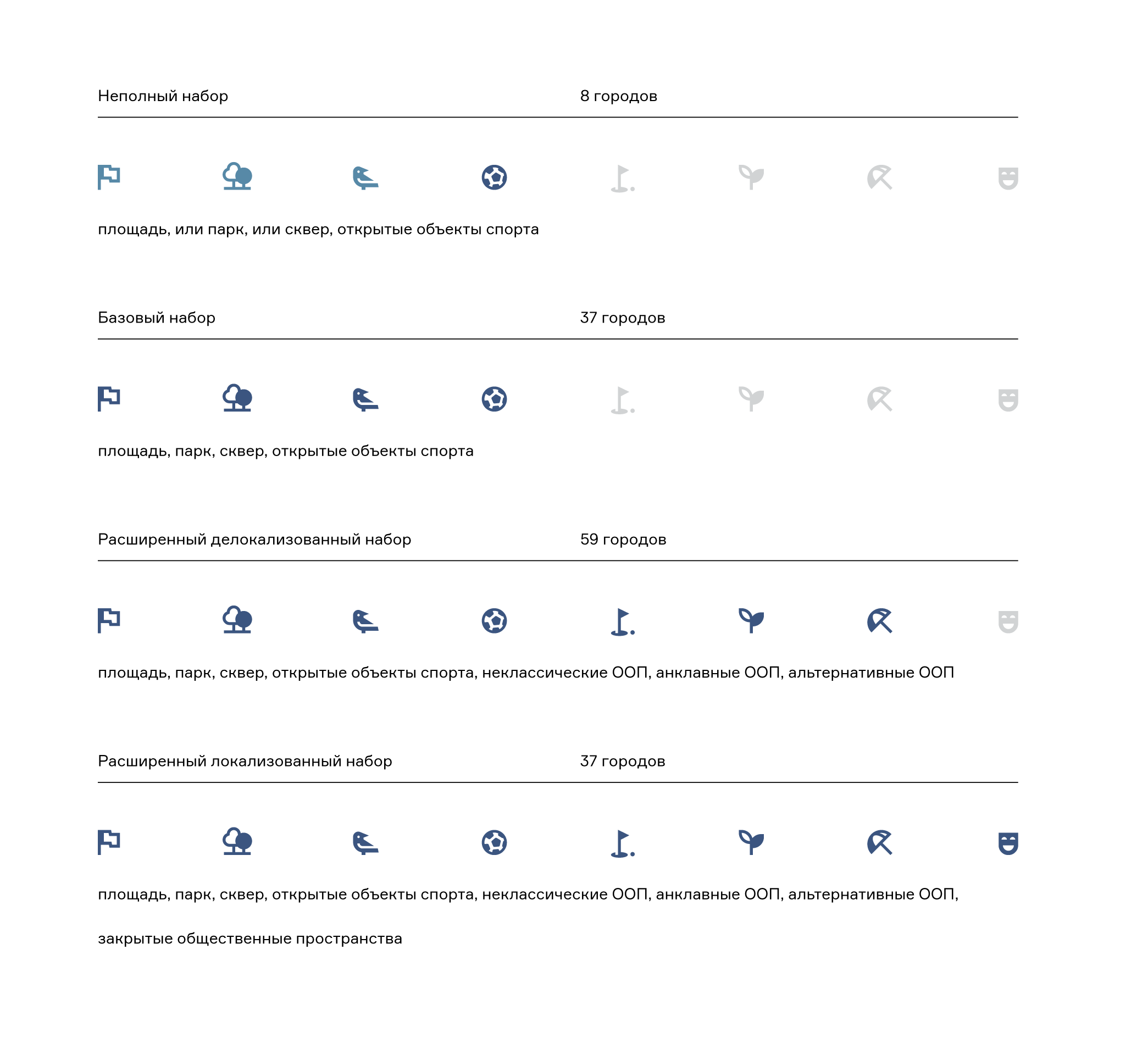 Рассмотрение номенклатурного состава общественных пространств как раз и показало, что в большей части городов (96 из 141) встречается расширенный набор общественных пространств, и только треть (45 из 141) имеет базовый набор или лишь его отдельные элементы. При этом примерно в 40 % всех городов (56 из 141) целостные системы общественных пространств не сформированы.
