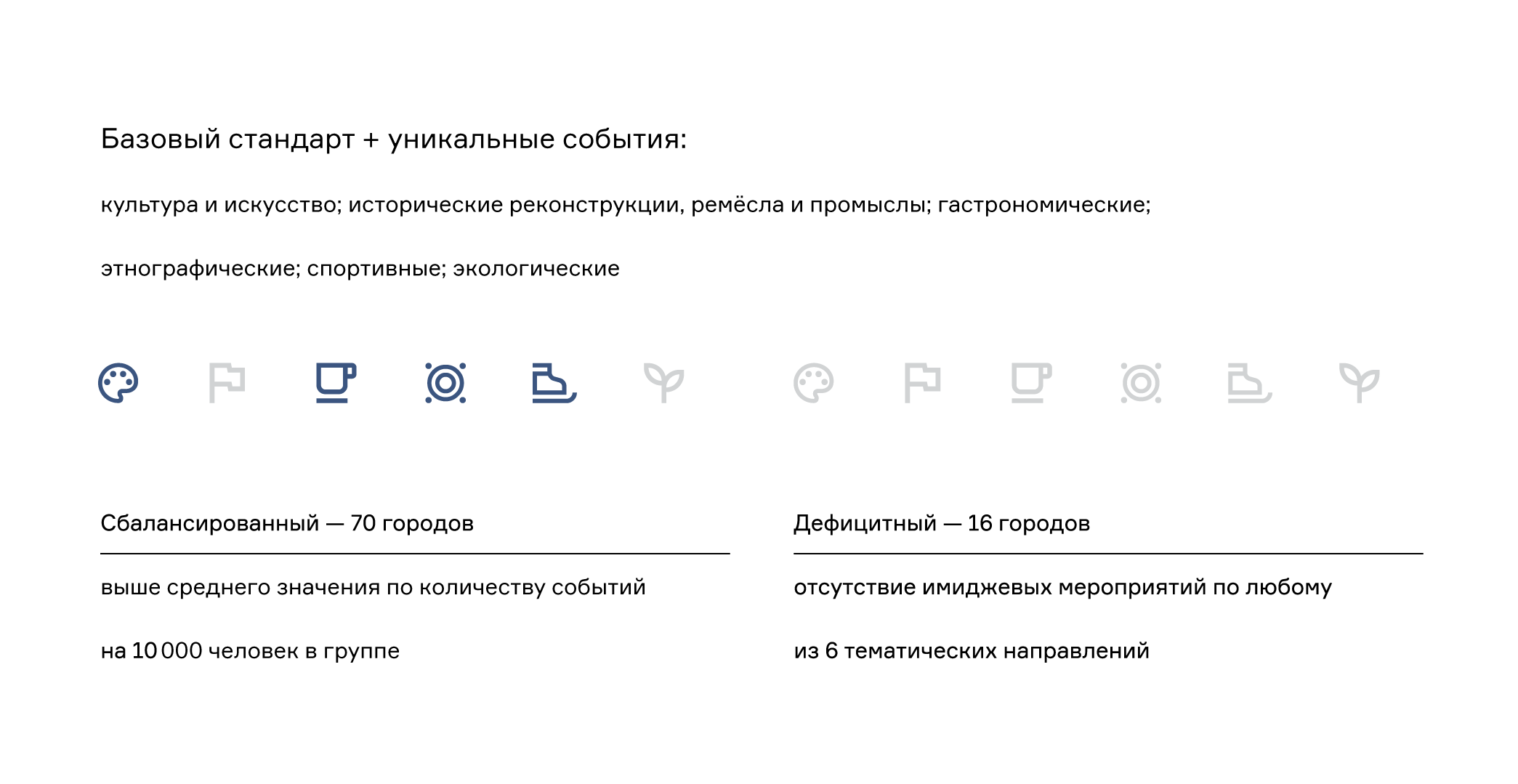 Анализ событийной программы, исходя из оценки этих факторов, позволил опять-таки сформировать применительно к выделенным восьми группам городов как базовый набор событий, так и перечень уникальных форматов.