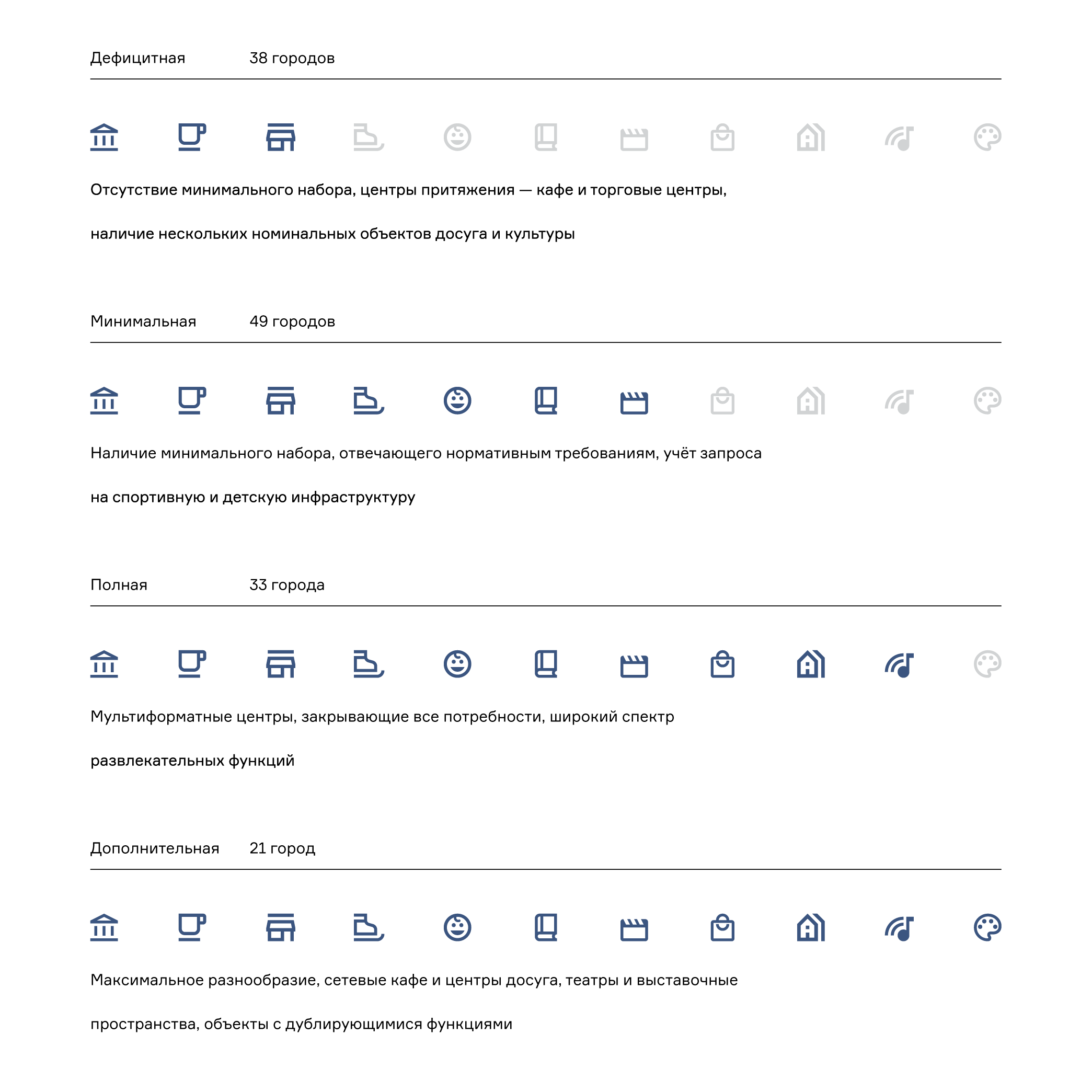 На основании выявленных закономерностей распределения закрытых общественных пространств — по аналогии с открытыми общественными пространствами — из всего перечня объектов, представленных в классификаторе, были выделены ключевые, наличие которых говорит о минимально необходимом обеспечении города функциями закрытых общественных пространств. Это позволило оценить степень развитости их системы: в зависимости от общей обеспеченности закрытыми общественными пространствами (в пересчете на население города) и от функционального разнообразия ключевых объектов были выделены 10 типов обеспеченности городов, укрупненные до четырех.