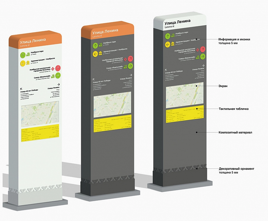 Конструкции с картами и основными данными значительно упрощают ориентирование в городе. Благодаря дизайну стелы хорошо заметны издалека, но при этом не отвлекают внимание от информационных полей. Основные цвета дизайна — белый и темно-серый — позволяют стелам гармонично вписаться в городской пейзаж.