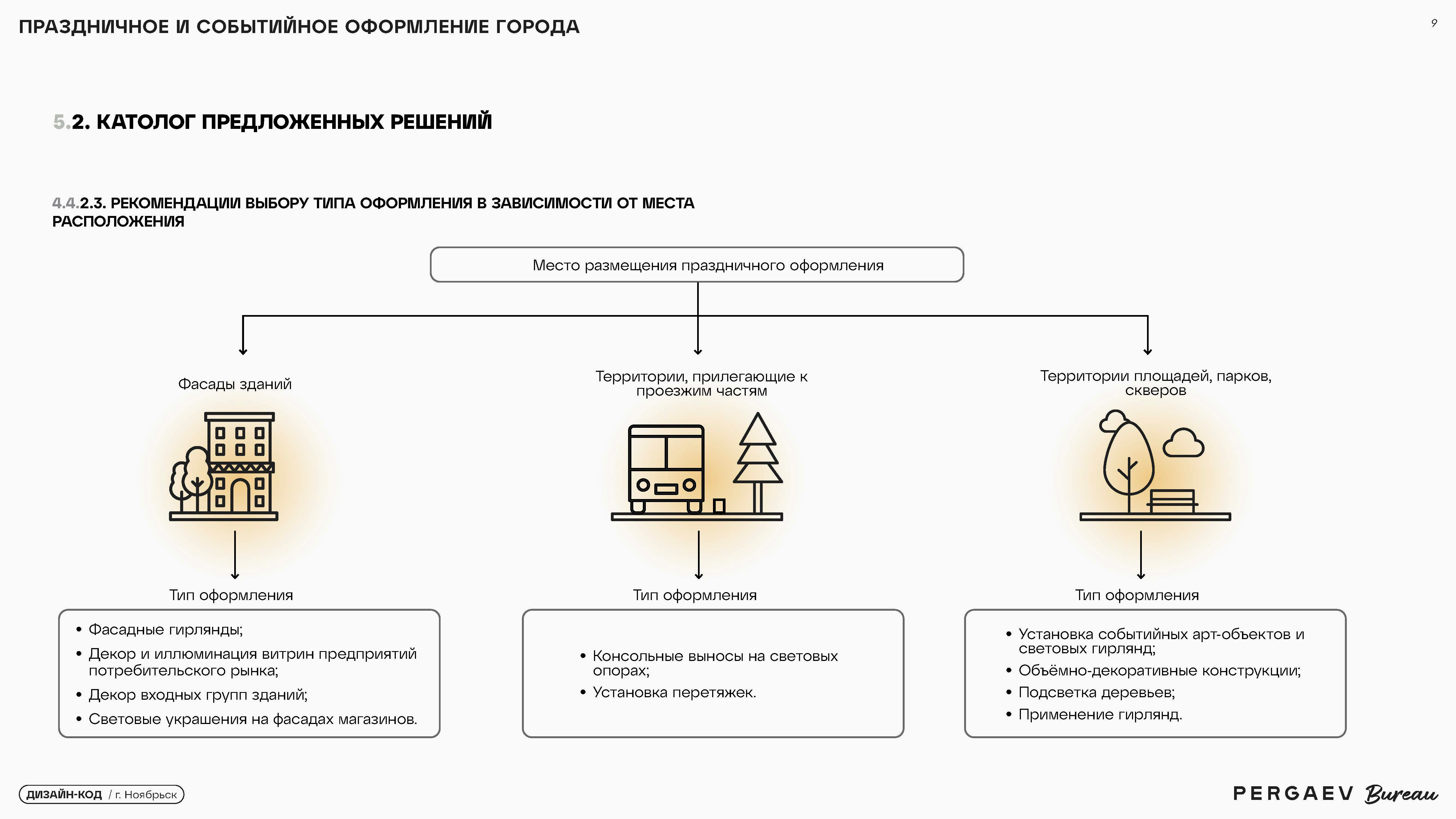 Выбор ключевых разделов основан на 7-летнем опыте работы Pergaev Bureau с объектами городской среды Ноябрьска.