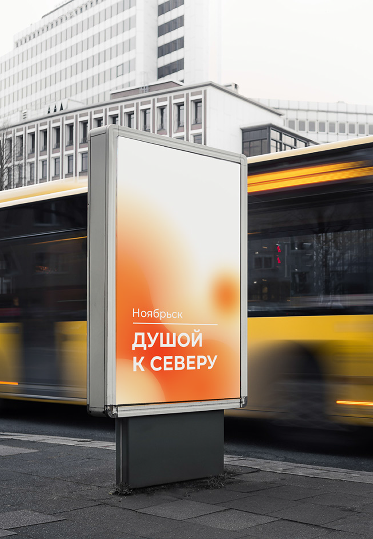 Рекламные и информационные носители демонстрируют, как дизайнеры интегрировали северную культуру в дизайн среды. Архипелаг теплых пятен на баннерах символизирует культуру дружелюбия, комьюнити, посыл «вместе теплее».
