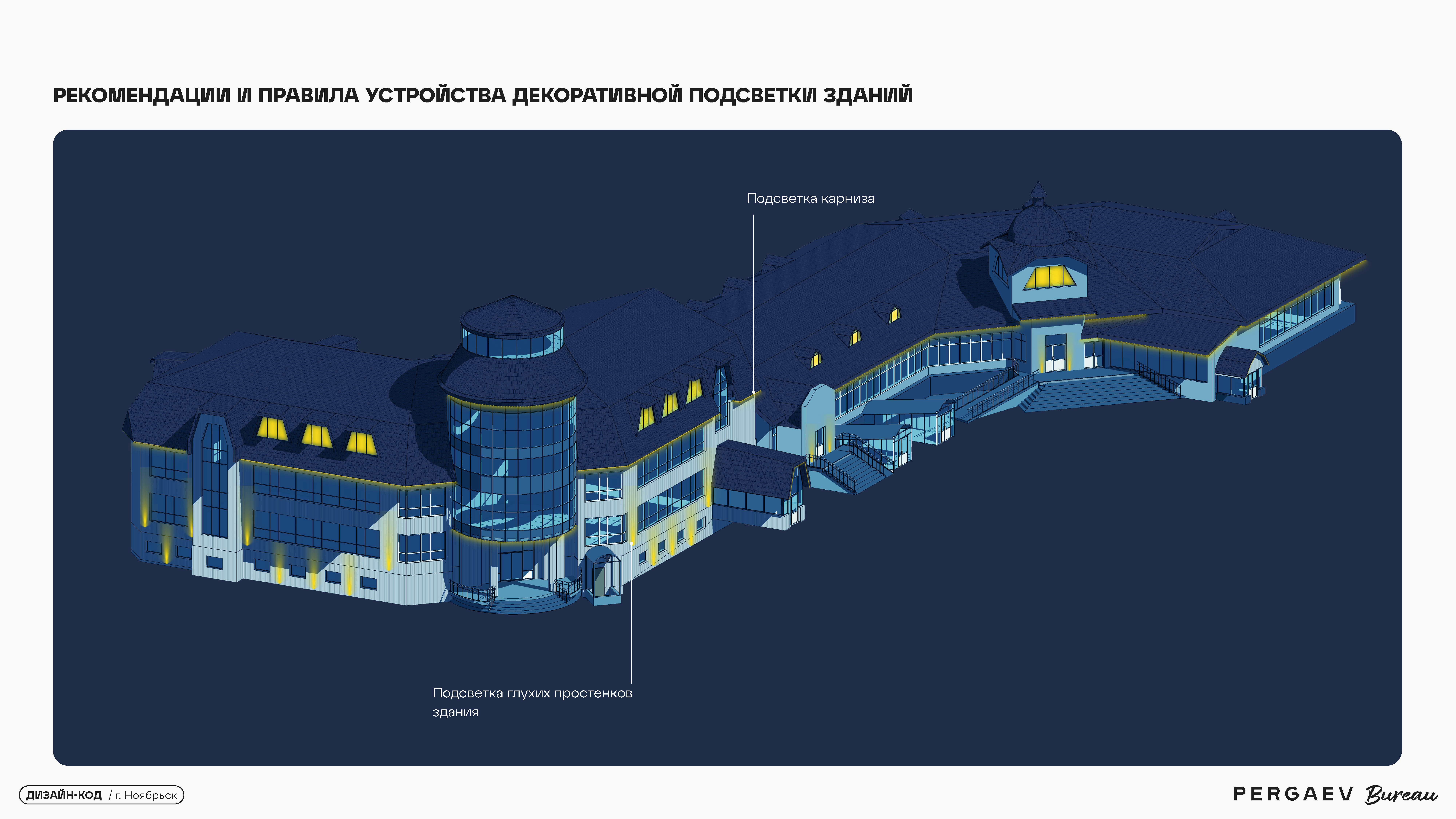Подчеркну, что для разработки дизайн-кода каждый город ставит различные цели и объем работ перед архитектурным бюро. Среди разработанных разделов концепции дизайн-кода Ноябрьска — архитектура зданий и рекомендации по улучшению восприятия, благоустройству улиц и созданию комфортного пространства, рекламные и информационные носители, праздничное и событийное оформление города.