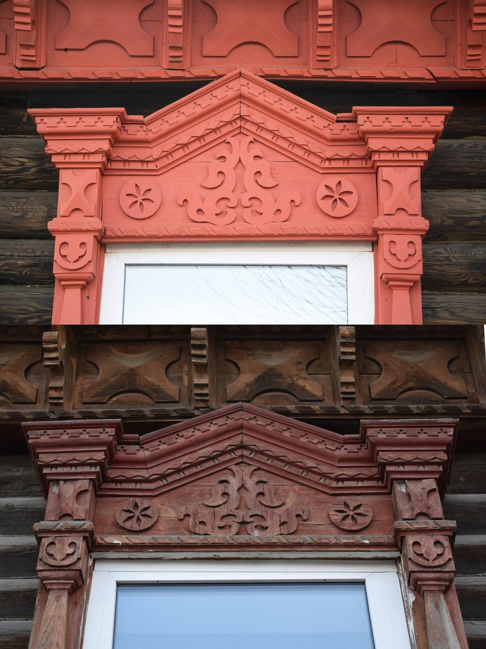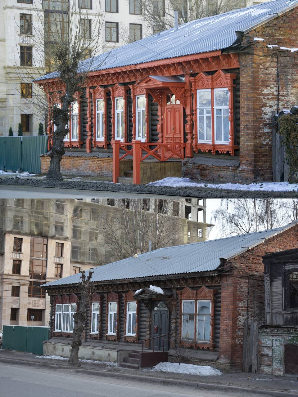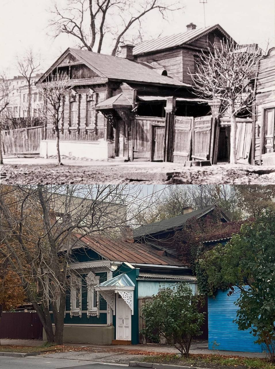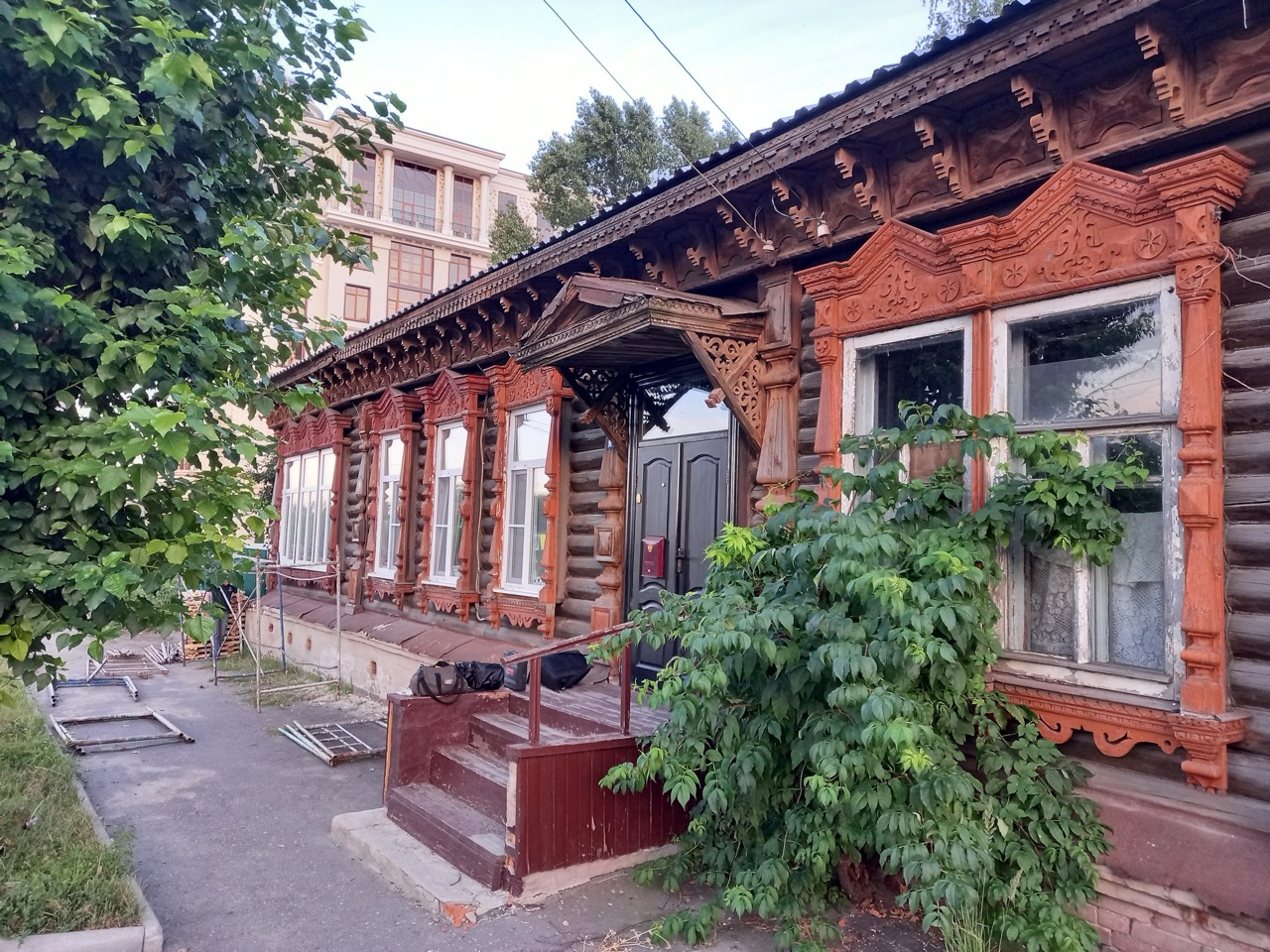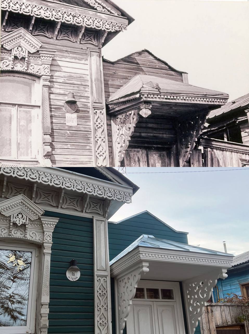 Как раз по такому принципу мы выбрали дом на улице Гоголя. В ходе работ удалили с фасада старую краску, покрыли его грунтовкой и покрасили, изготовили и установили новые карнизные доски с растительным орнаментом, вернули утраченный декор и первозданный вид наличников. Позже восстановили и крыльцо с навесом. Оригинал не сохранился, и мы работали по историческим фото — все сделали заново, буквально каждый элемент.