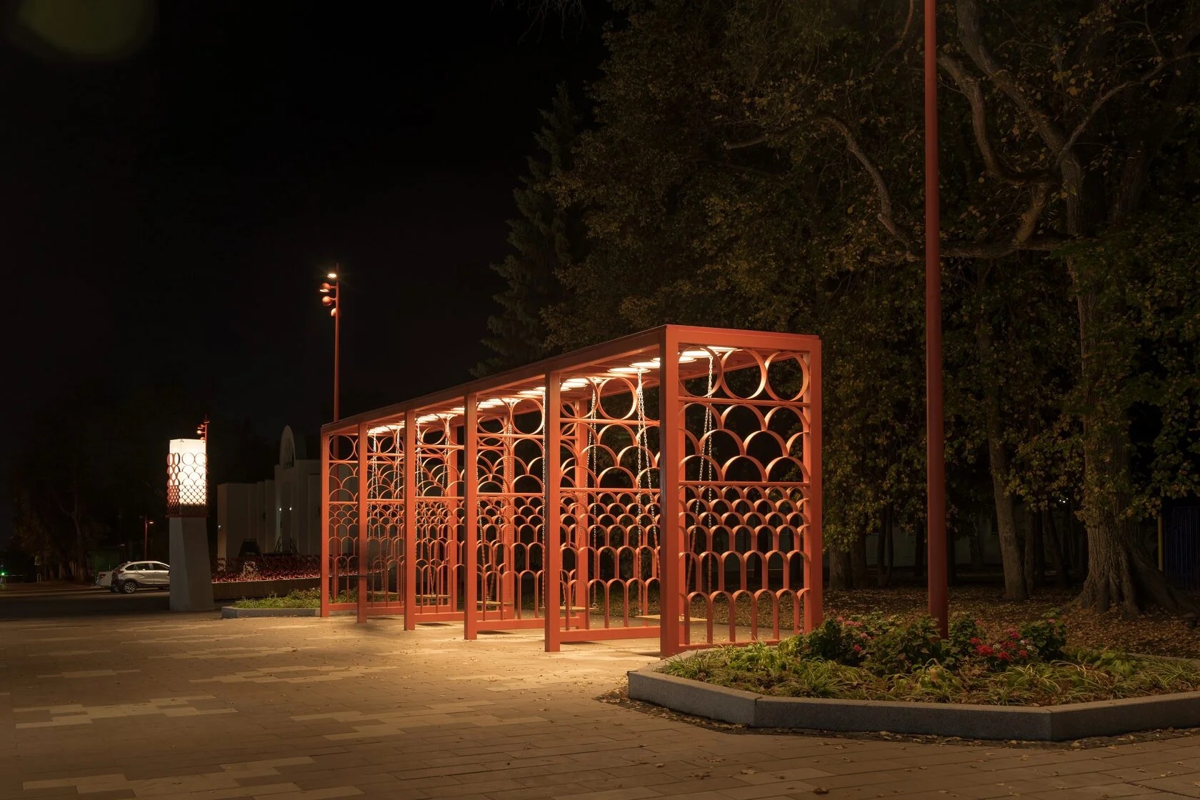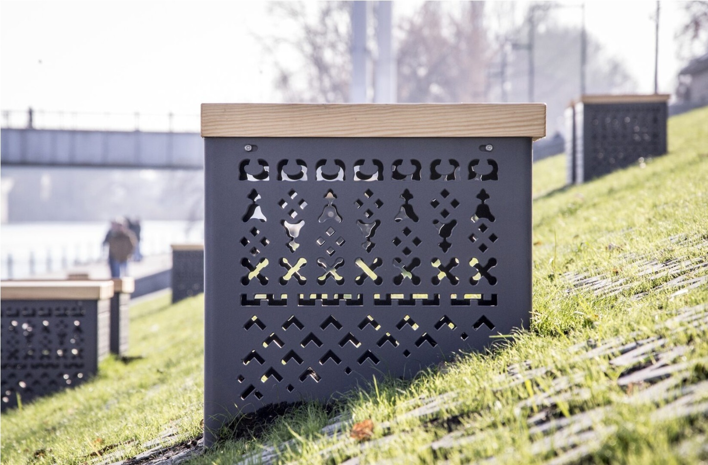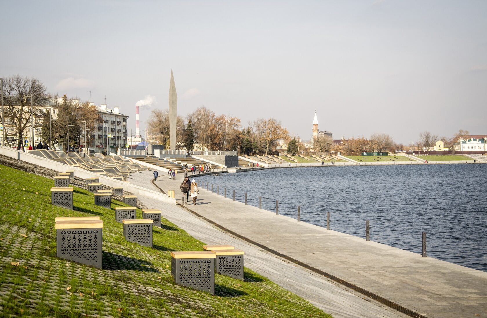 Набережная реки Суры когда-то была районом деревянной застройки со своими уникальными мотивами резьбы. Чтобы напомнить о них, в новых элементах благоустройства (гамаки, качели, скамейки) мы использовали паттерн по мотивам декора пензенских деревянных домов.