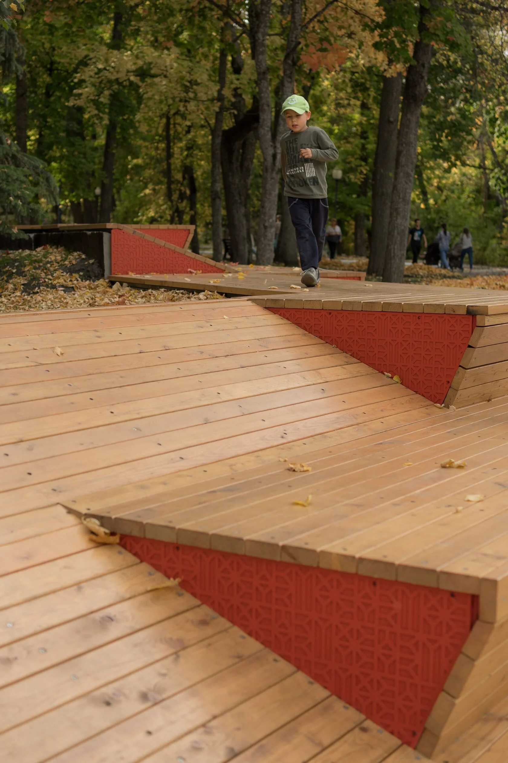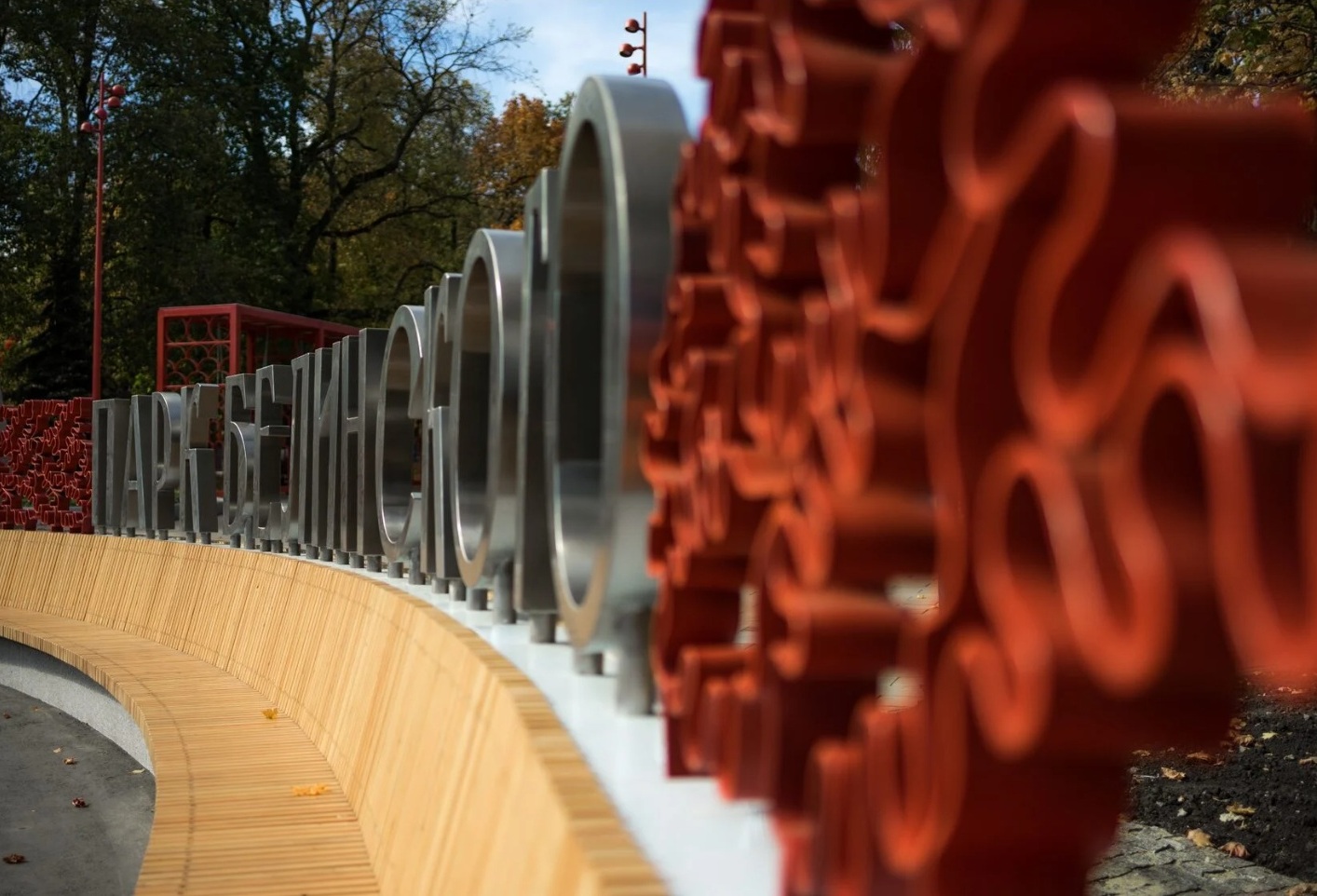 Весь проект основан на исторических и природных ритмах. Символ парка — дуб, поэтому ограждение мы заменили на вязь из дубовых листьев и спроектировали новые фирменные «чешуйчатые» скамейки. «Чешуя» отсылает и к фактуре шляпки желудя (их в парке много!), и к популярному орнаменту 1950-х, когда была спланирована парковая площадь.