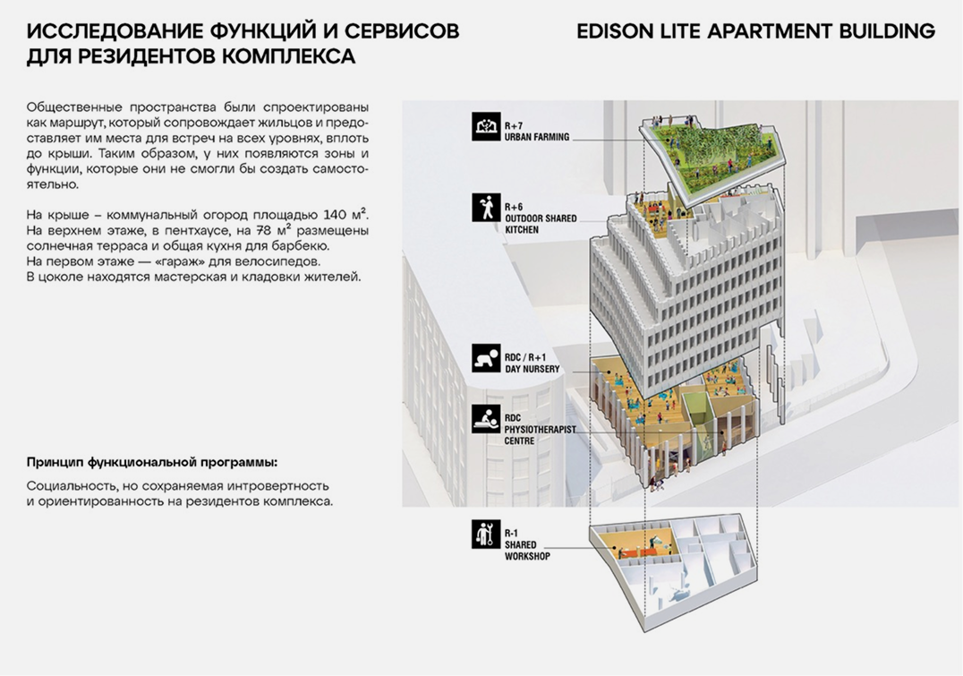 Целью конкурса было переосмысление сложных участков города и поиска новых моделей городской застройки. Дом организован под сообщество людей, близких по своим интересам. Так, часть квартир распределялись на конкурсной основе по льготной цене, где предпочтение отдавалось заявителям, готовым к садоводческим экспериментам. В результате Edison Lite соединяет экологичные материалы, вертикальное озеленение, всевозможные сервисы, городскую ферму на крыше и помещения общего пользования (терраса для барбекю и солнечных ванн) — аккурат вместо «элитного» пентхауса.