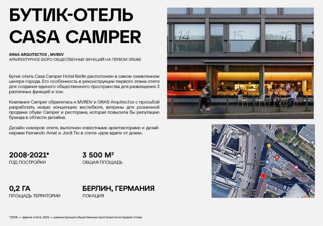 Отельный проект обувного бренда создан для продвижения идеологии компании, которая считается приверженцем циркулярной экономики. Отель расположен в культовом и космополитичном районе Митте, в котором ключом бьет культурная и общественная жизнь. Двухметровый раздвижной стеклянный фасад бутик-отеля формирует открытую и одновременно уютную связь с улицей. А на потрясающие виды Берлина можно любоваться в лаунже пентхауса отеля.