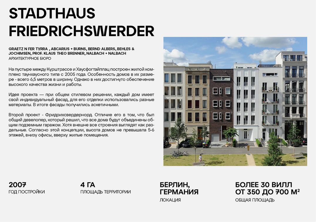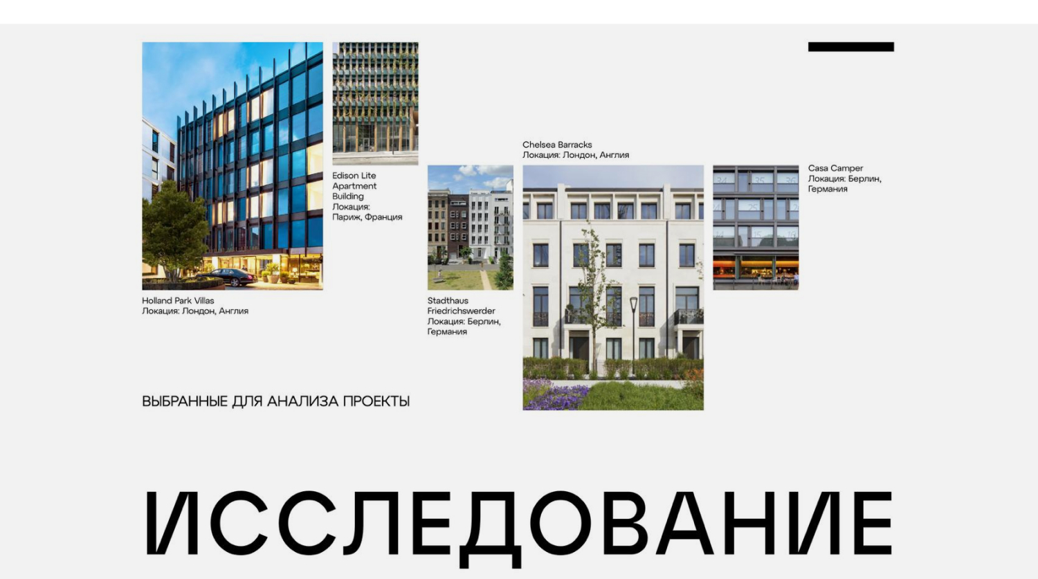 В объектив исследования преднамеренно попали проекты из европейских городов, так как, по мнению его авторов, именно в Лондоне, Париже, Берлине сильна традиция концептуализма — умения продолжать улицу, двор, квартал — в отличие от городов стран Ближнего Востока или США, где жилой комплекс часто строится как отдельный «мир», самодостаточный и оторванный от города.