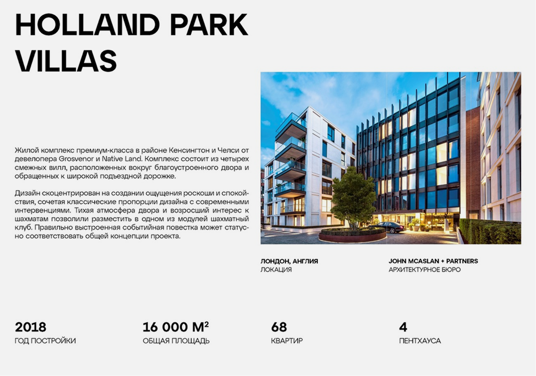 Расположенный в отличном месте с видом на зеленый парк Холланд, Holland Park Villas — это эксклюзивная закрытая жилая застройка в Королевском районе Кенсингтон и Челси от застройщика Native Land. Состоит из четырех современных «вилл» с 68 элегантными апартаментами и четырьмя пентхаусами, из которых открывается захватывающий вид на частный сад во внутреннем дворе, где организован шахматный клуб, и лесной ландшафт по периметру от Gillespies.